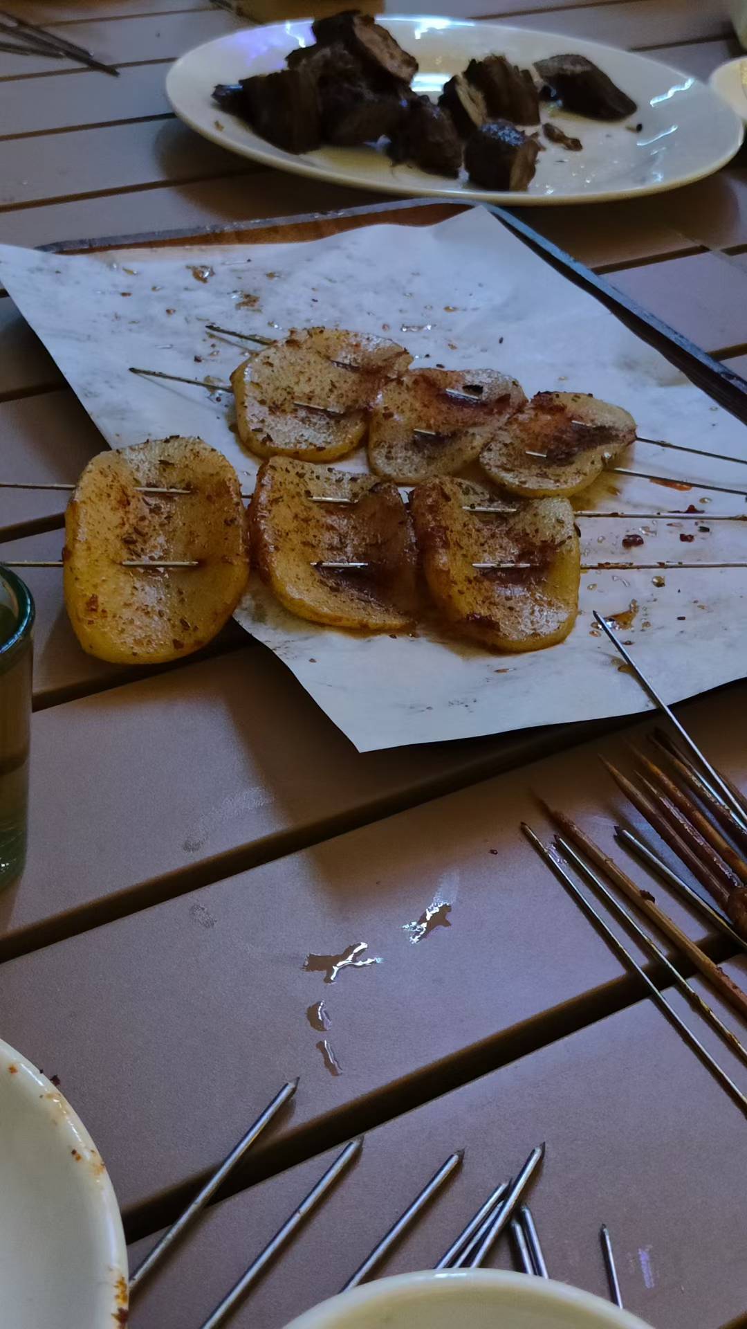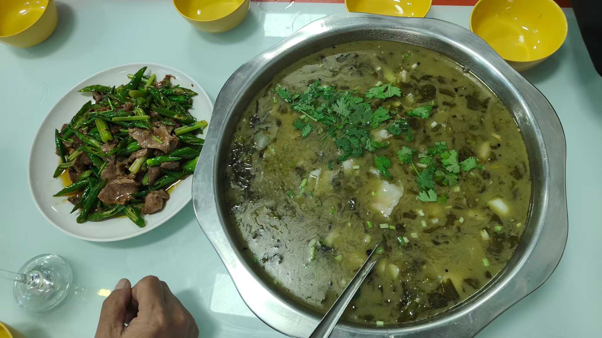 [今天的晚餐在雪山环绕的白沙湖旁吃酸菜鱼,从餐厅正面就能看到雪山。]
